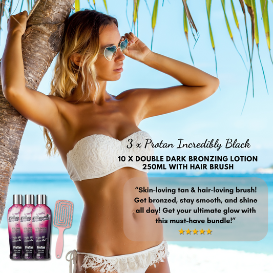 3 x Pro Tan Incredibly Black 10X Double Dark Bronzing Lotion 250ml + Hair Brush