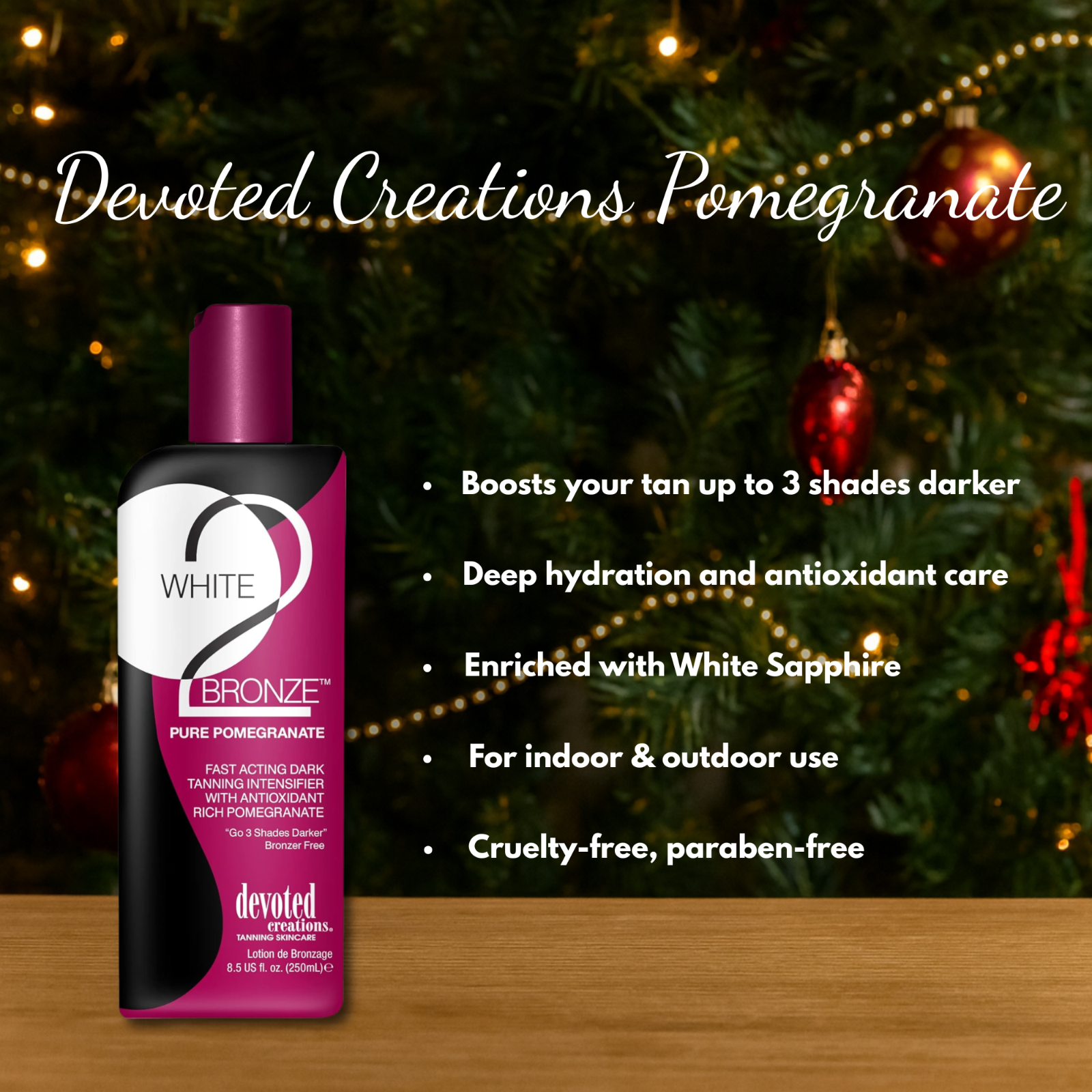This Devoted Creations White 2 Bronze Pomegranate Holiday Tanning Set includes two full-size 250 ml bottles of the ultra-dark bronzing lotion, plus sunbed goggles and a festive Christmas gift bag — the perfect ready-made gift for tanning lovers.