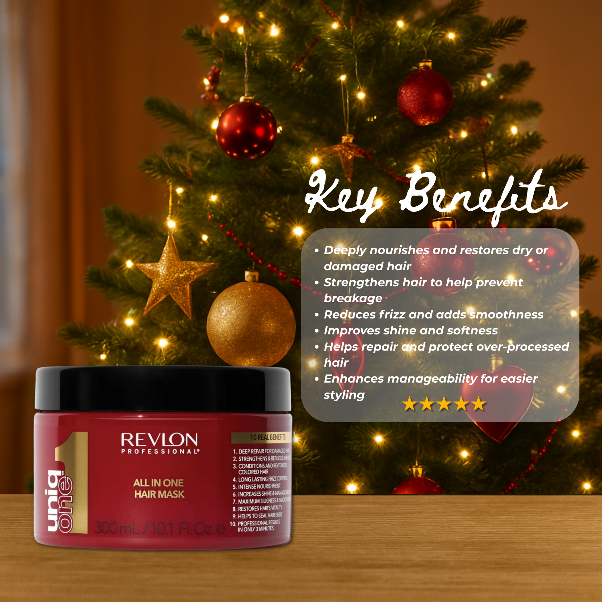 Give your hair deep nourishment and silky smoothness with this Revlon Uniq One Hair Mask Duo. This bundle includes 2 full-size 300ml masks, a premium hair brush, and a festive Christmas gift bag—perfect for gifting or upgrading your own haircare routine.