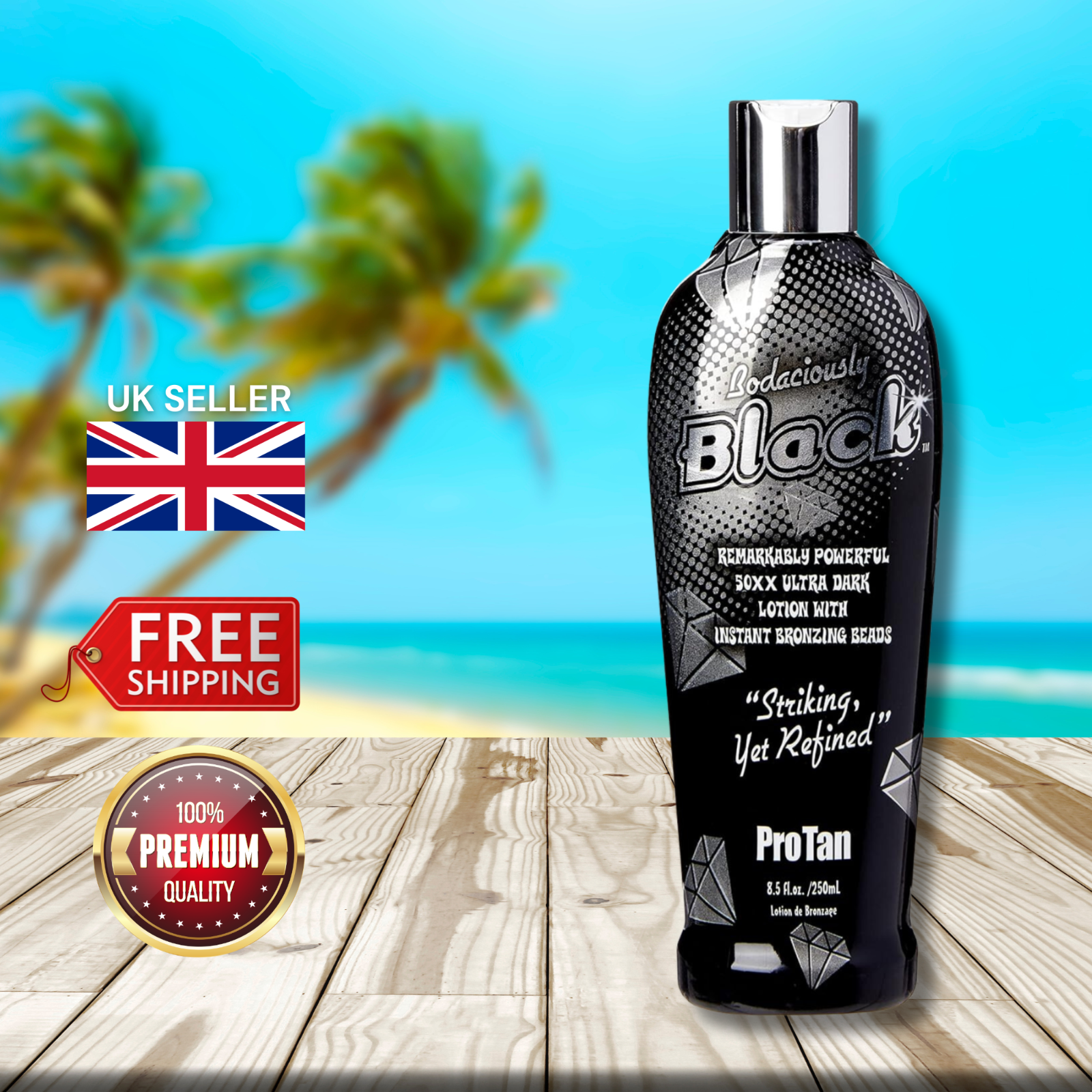 ProTan Bodaciously Black Remarkable Powerful 50xx Ultra Dark Tanning Accelerator (250ml) is an maximum tanning 50xxx ultra black lotion. Watch heads turn with your new found brazen bronze colour only achieved from this exceptionally silky smooth, advanced formula. Rich, moisture replenishing blend for temptingly touchable skin all day, every day with the added benefits of high speed micro bronzing beads that provide an instant burst of bronze for that perfect off the beach glow! This remarkable formula will leave you with a gorgeous, deep, dark, long lasting bronze colour for all to envy!